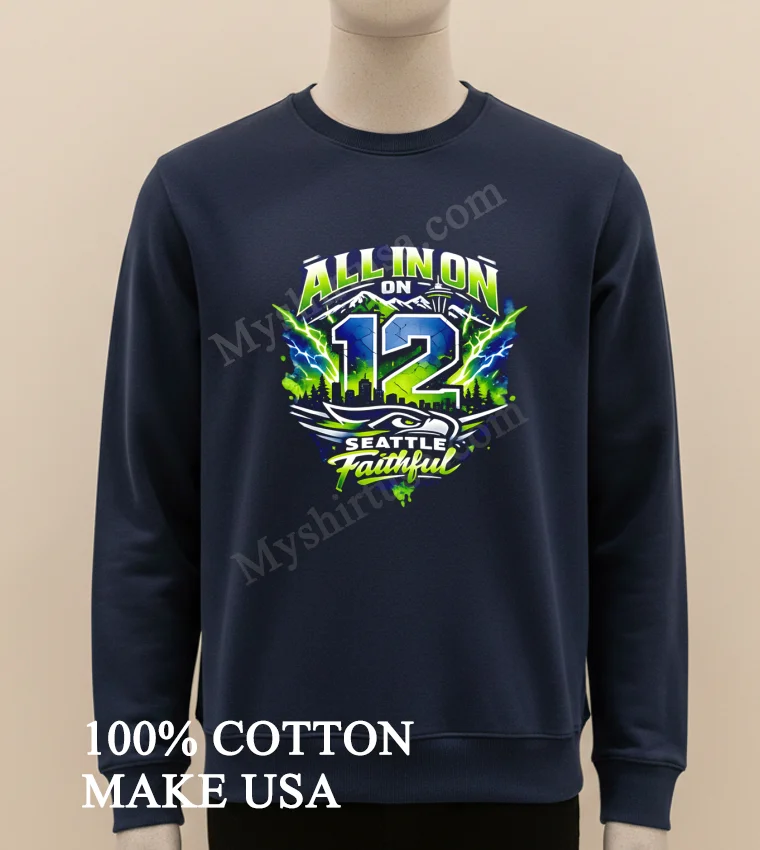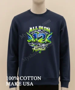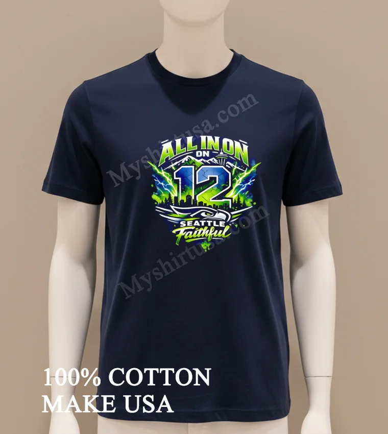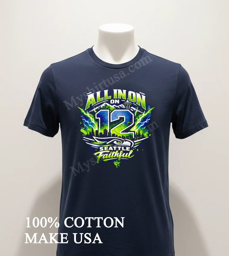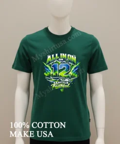Now, let’s talk about the design and feel, because this isn’t just any shirt. The All In On 12 Seattle Faithful Seahawks Mountain City Skyline Lightning Shirt stands out with its intricate graphic. That bold “12” for the legendary 12th Man, intertwined with the iconic Seattle skyline, the majestic Mt. Rainier in the background, and a dynamic lightning bolt it tells a story, unlike those plain logo tees. It’s printed on 100% American Cotton, which means it’s not only super soft and breathable, but it holds up. I love to style mine with a pair of distressed jeans for that perfect streetwear vibe, or layer it under a light denim jacket for a cooler evening. To keep it looking its best, I always wash it inside out in cold water, and tumble dry on low my mom always taught me to care for my favorite clothes, and this one deserves it! You’ll find fellow fans discussing the latest gear and styling tips on Reddit’s r/Seahawks or in various Facebook fan groups.