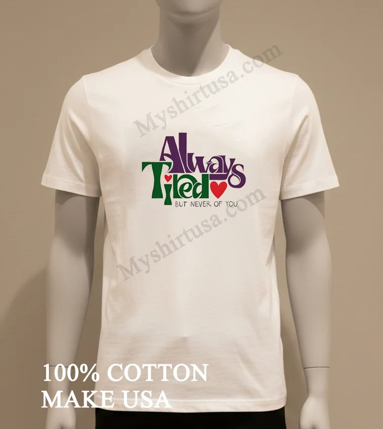 Let’s talk details because this isn’t just any graphic tee you’d pick up on a whim. The design itself, featuring that ‘Always Tired But Never Of You’ text in a cool, retro typography with a subtle heart accent, is a masterclass in understated cool. It’s got that nostalgic vibe without feeling dated, like it could’ve been pulled straight from a vintage shop in Brooklyn, but with a modern twist. Unlike those mass-produced shirts with stiff, cracking prints, ours uses a high-quality, durable printing technique that blends seamlessly with the fabric. That means no peeling, no fading, just a design that looks great wash after wash. It’s expressive but not over-the-top, making it way more versatile than a lot of the fleeting trend pieces out there.