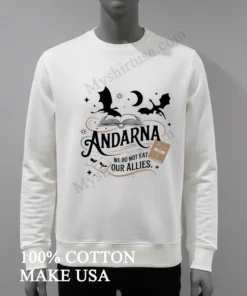 Ready to wear your allegiance and show off your love for the dragons? Why wait to join the legion of fans? Grab your Andarna We Do Not Eat Our Allies Dragon Fantasy Book Shirt today! Crafted from 100% American Cotton, it’s soft, stretchy, and breathable, promising comfort and style. All for just $23 USD, delivered right to your door in 3-5 days in the US. It’s the perfect blend of Vintage, Streetwear, and American style.