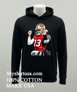 Let’s talk design. This isn’t just some hastily slapped-on graphic. The print itself is vibrant, crisp, and really pops showcasing Purdy in that iconic Dougie pose. What sets it apart? It’s not just another team logo; it’s a specific, memorable moment frozen in time, unique to his incredible run. You won’t see everyone else wearing the exact same thing, giving you that ‘IYKYK’ (If You Know, You Know) cool factor.