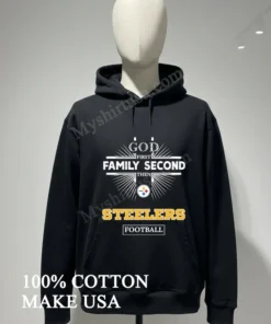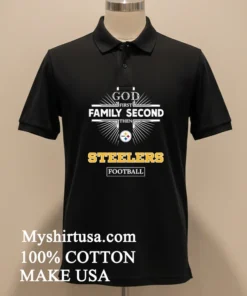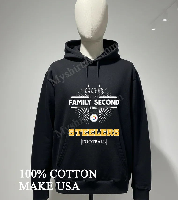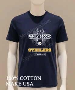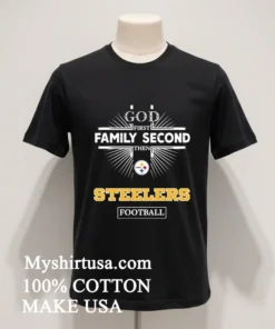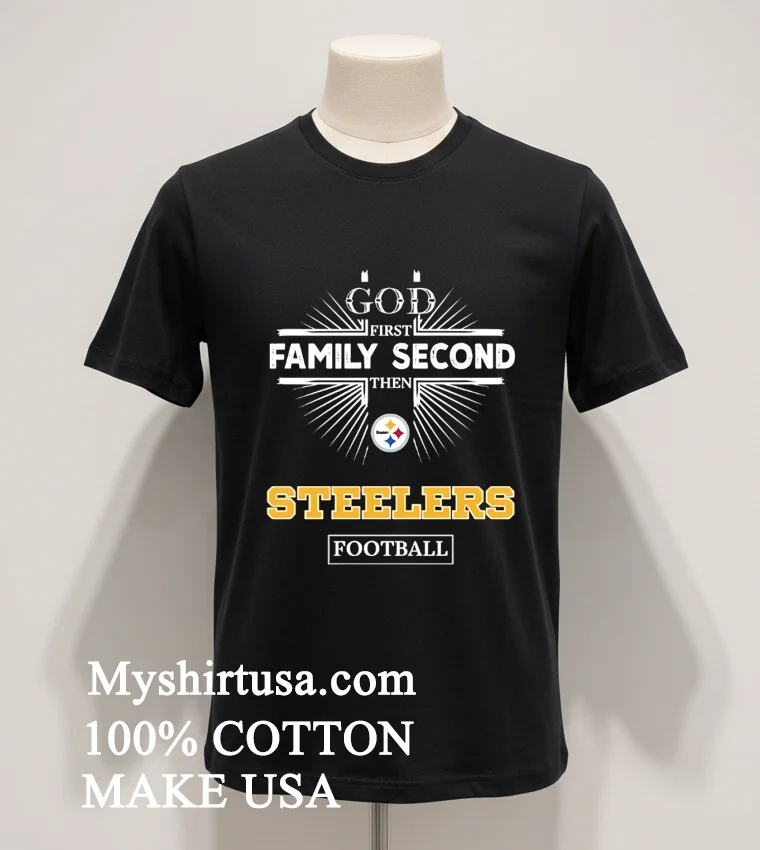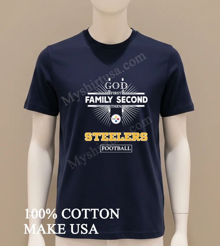 This isn’t just a shirt; it’s a statement! With football season kicking into high gear, from pre-season jitters to those nail-biting playoff games and Super Bowl dreams, the demand for unique fan gear explodes. Show your true colors at tailgates, watch parties, or just running errands. At myshirtusa.com, you can effortlessly grab your own God First Family Second Then Steelers Football Shirt tee. It’s the ultimate Pittsburgh Steelers fan shirt, a spiritual Steelers apparel piece, perfect for anyone searching for Steelers fan gear, unique football t-shirts, or pro-faith sports wear.
