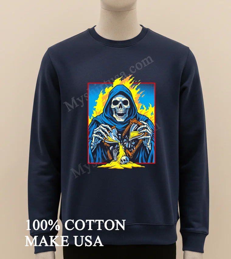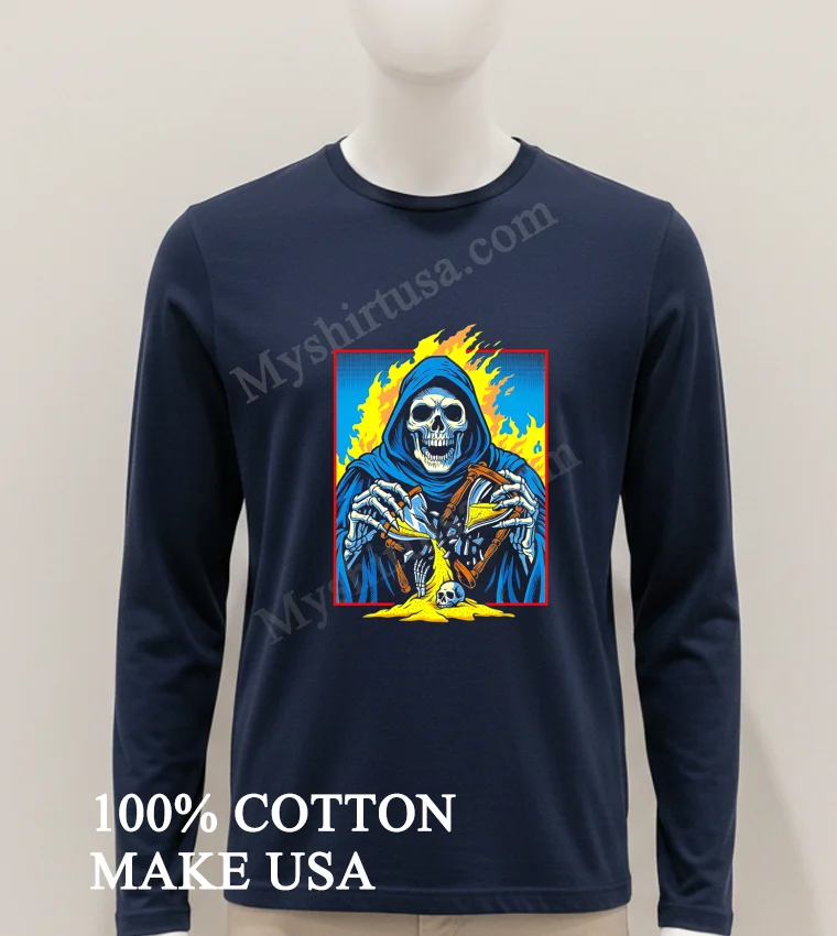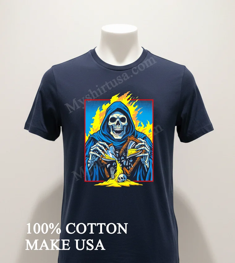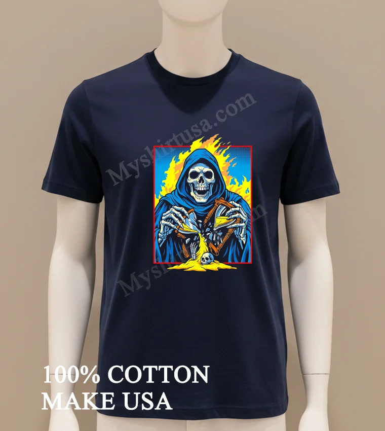 Ready to upgrade your wardrobe with a piece that truly tells a story? Don’t you deserve comfort and style that makes an impact? Our Grim Reaper Skeleton Breaking Hourglass With Yellow Sand Shirt, made from 100% American Cotton, is soft, stretchy, and breathable, all for just $23 USD. Experience the thrill of fast delivery 35 days right to your door in the US. Embrace that Vintage, Streetwear, American style!