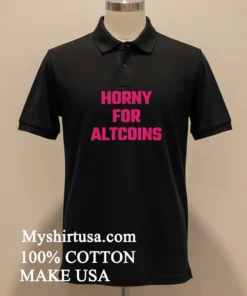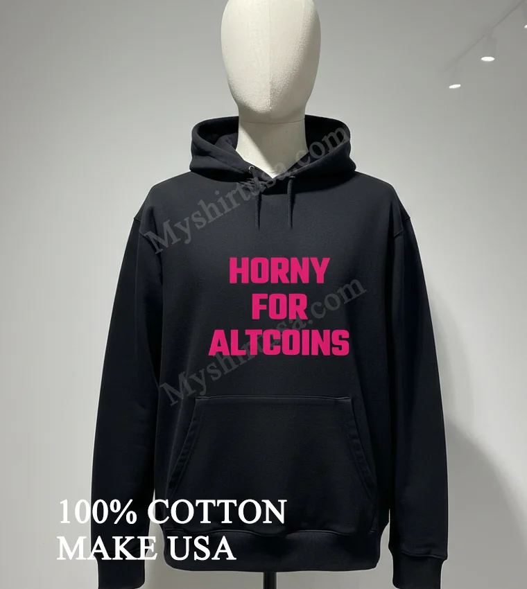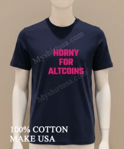 Here’s a standard SEO product listing for the Horny For Altcoins Pink Text Bold Crypto Shirt on WooCommerce, written in an American style and tailored to your requirements: