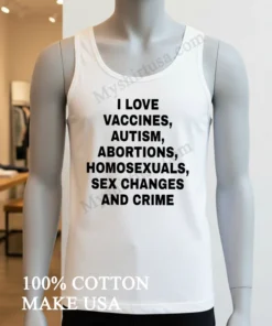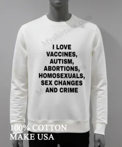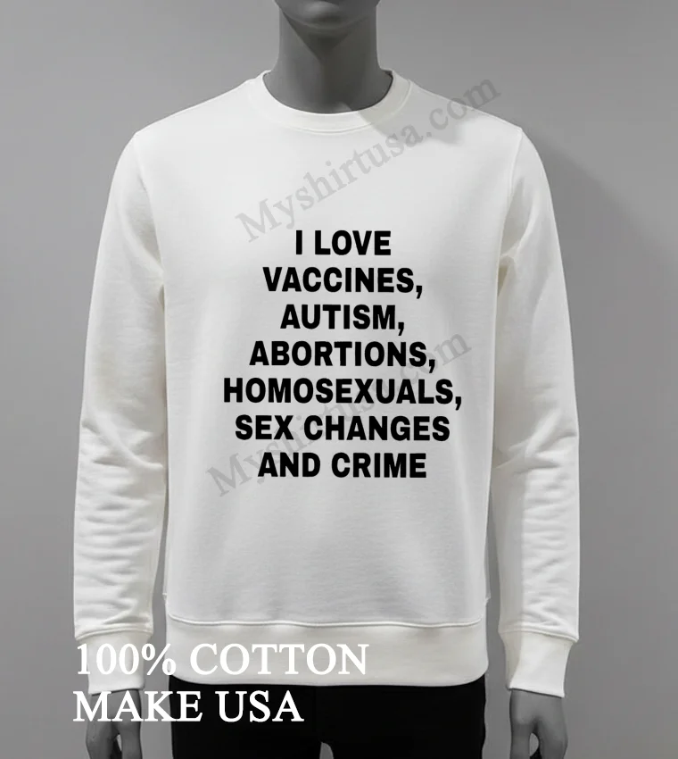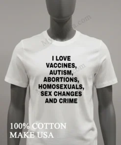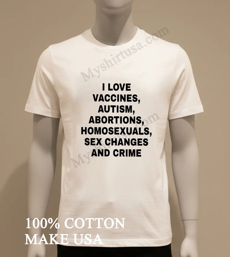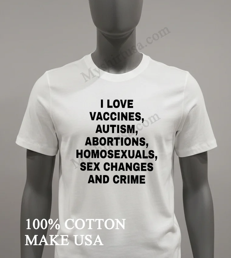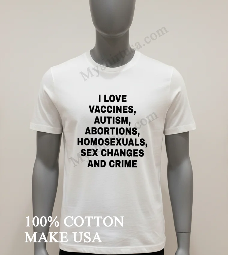 Wow, seriously, the reviews weren’t kidding! My last order from Myshirtusa arrived so fast, like, 3 days flat, and the free shipping? A total game-changer. I’m always a bit hesitant about online returns, but their policy seems super clear and straightforward, which is a relief. This new I Love Vaccines Autism Abortions Homosexuals Sex Changes And Crime Shirt feels just as soft and comfortable as my other tees from them they’ve quickly become my go-to for daily wear because they just hold up so well.