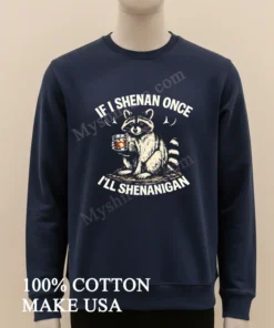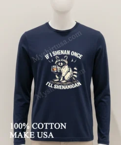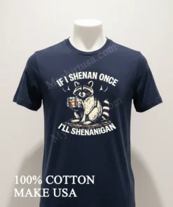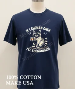 What truly makes this tee a standout in a closet full of basics? It’s that wonderfully mischievous raccoon, drink in paw, paired perfectly with the phrase: “If I Shenan Once I’ll Shenanigan.” More than just another funny graphic tee, it perfectly captures a whole vibe, effortlessly fitting into today’s relaxed yet stylish American streetwear trends. Crafted from premium, 100% American cotton, it’s incredibly soft, breathable, and frankly, a far superior feel compared to those stiff, generic imports. I love styling mine with my favorite distressed jeans and classic sneakers for that ultimate laid-back weekend look, or layering it under a cool denim jacket when the evening air gets crisp. To keep that vibrant print crisp and the fabric luxuriously soft for years, always remember to wash it inside out with cold water, then tumble dry on low, or even better, simply hang it to air dry. You’ll find fellow fans discussing their “shenanigan shirts” all over TikTok, Instagram reels, and Reddit’s r/funny it’s guaranteed to be a conversation starter.