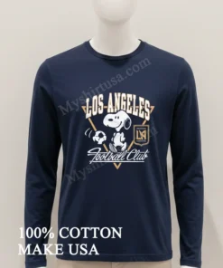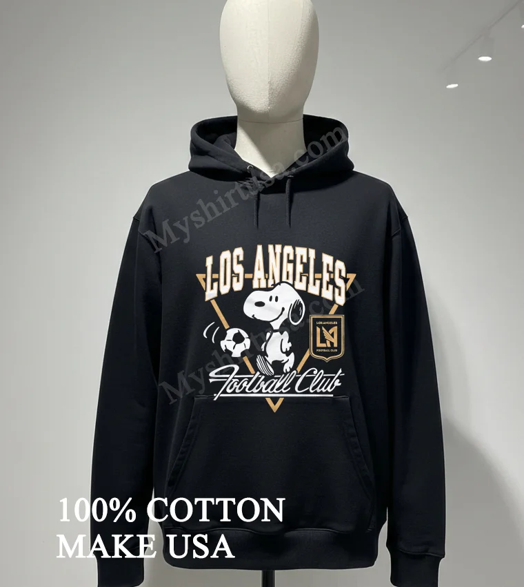 Now, let’s talk about why this isn’t just any T-shirt. First off, the design itself: it’s not just a logo slap. We’re talking Snoopy, America’s beloved beagle, kicking a vibrant gold soccer ball with that iconic LAFC crest, all on a sleek black canvas. It’s got that nostalgic vibe mixed with modern sports fandom a real conversation starter, unlike those bland, mass-produced tees. Material-wise, it’s 100% American Cotton, which means it’s ridiculously soft, breathable, and feels amazing against your skin, perfect for those warm California days or layering up on cooler evenings. Style it with ripped jeans and fresh sneakers for that effortless streetwear look, or pair it with cargo shorts for a laid-back vibe. As for keeping it pristine, a simple cold wash, tumble dry on low, and avoiding bleach will keep Snoopy and the LAFC crest looking sharp for seasons to come. You’ll see folks sharing their looks and discussing similar tees on Reddit’s r/MLS or r/Streetwear, and all over TikTok and Instagram.