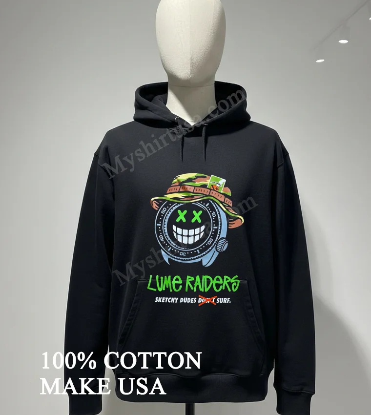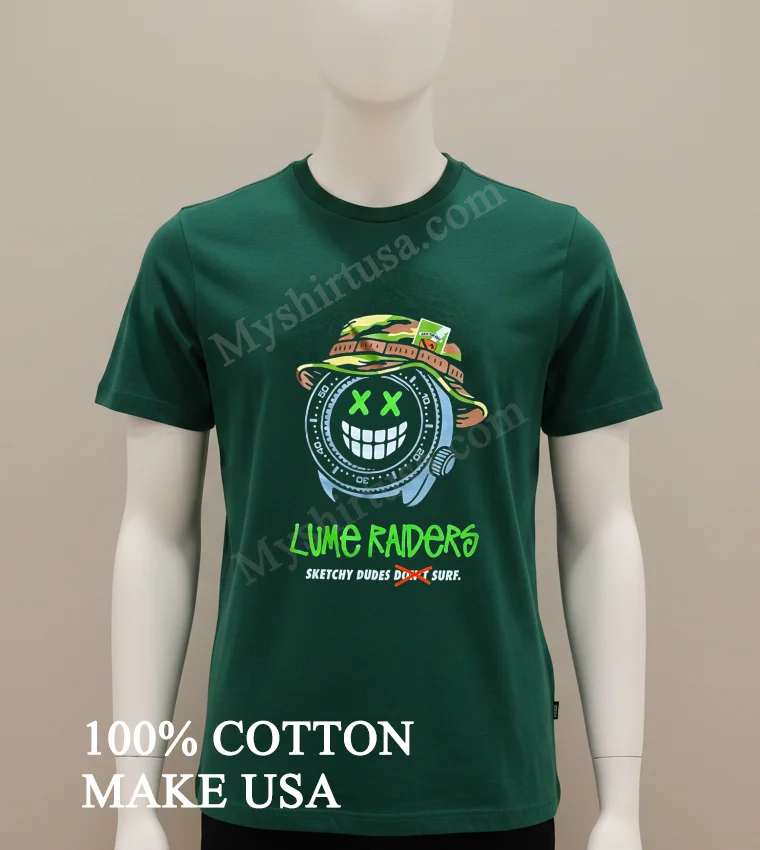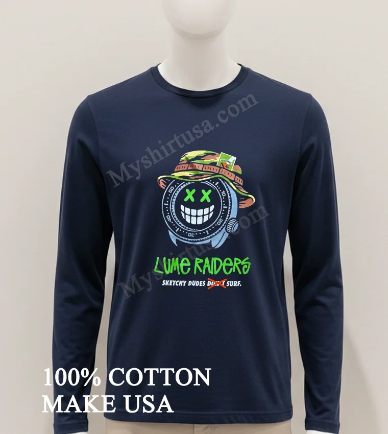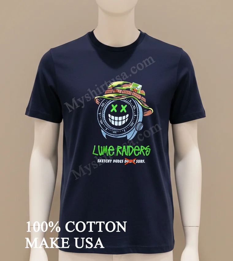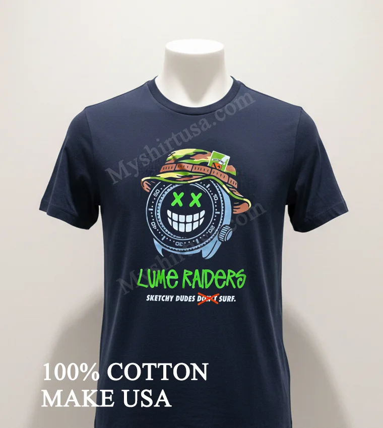 Let’s talk about what makes this tee a standout. The design itself, featuring that iconic watch face smiley infused with the “Lume Raiders Sketchy Dudes Don’t Surf” text, is a fresh take on classic surf culture mixed with a touch of indie cool. Unlike those flimsy, one-wash wonders, this shirt is crafted from 100% premium American Cotton. It’s not just soft and breathable; it’s got that perfect weight that feels substantial and drapes just right. You can style it a million ways: throw it over some board shorts for a beach day, tuck it into high-waisted jeans for a casual Friday, or layer it under an open plaid shirt for that quintessential American streetwear look. To keep it looking fresh, wash cold inside-out, tumble dry low, and skip the harsh bleaches. Trust me, it’ll be a wardrobe staple for ages. You’ll find people chatting about similar unique graphic tees on Reddit’s r/streetwear or showing off their styling on TikTok and Instagram daily.