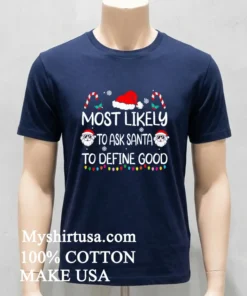 “Absolutely thrilled with my purchase!” That’s just one of the many glowing reviews we get for our unique tees. Customers consistently rave about the super-fast delivery, often seeing their Most Likely To Ask Santa To Define Good Christmas Shirt arrive in just 3-5 days, completely free of charge. “The quality is fantastic, and it got here so quickly!” says another happy shopper. Got questions about our fuss-free return policy? We’ve got you covered. It’s truly a joy to hear how much everyone loves their new favorite tee from Myshirtusa.