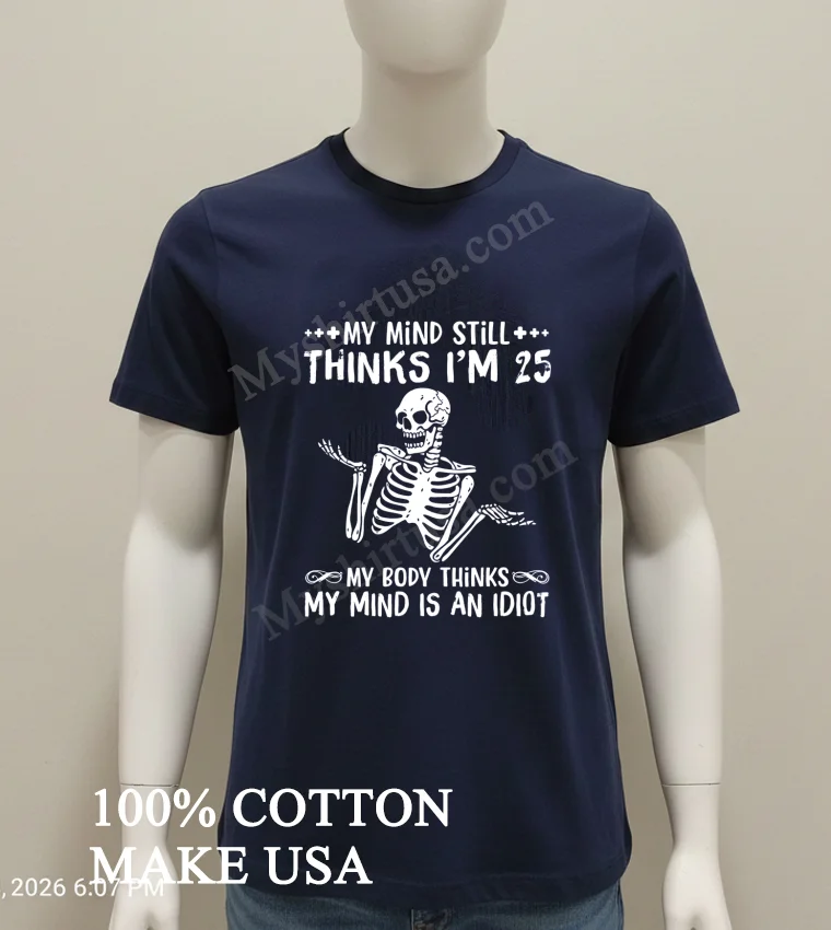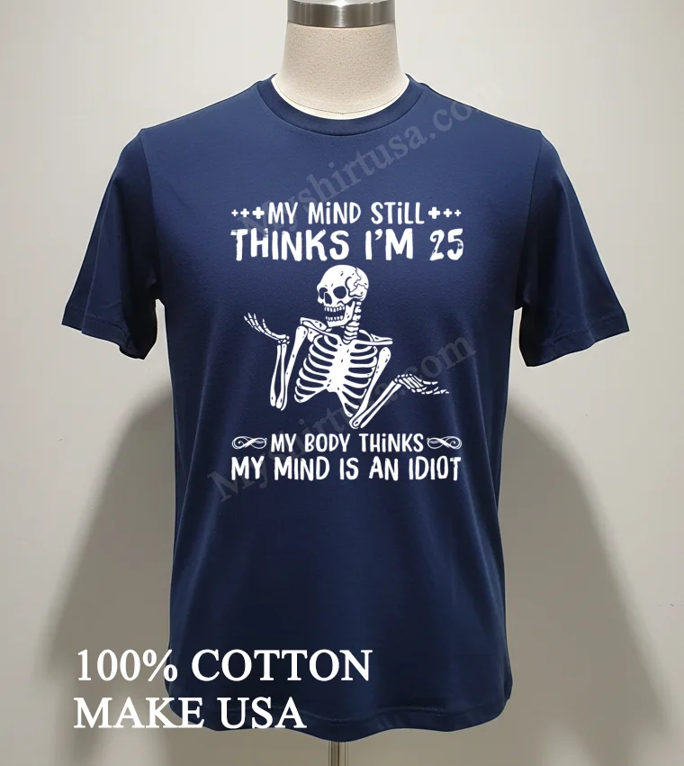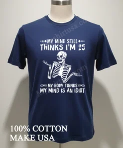 What truly sets this shirt apart is its brilliantly simple yet hilarious design. The shrugging skeleton graphic with the “My Mind Still Thinks I’m 25” text is a conversation starter, guaranteed to get a chuckle. Unlike those flimsy, iron-on designs you sometimes find, this print feels durable and well-integrated. It’s printed on a premium, ringspun cotton fabric you can immediately feel the difference. As an American consumer, I appreciate quality that lasts. This isn’t your average stiff cotton tee; it’s soft, breathable, and drapes just right, not too tight, not too baggy. I love rocking mine with a pair of distressed jeans and sneakers for a laid-back look, or even layering it under an open flannel shirt for that classic Americana vibe. To keep it looking its best, a simple cold wash and tumble dry on low heat is all it needs. Easy peasy, just like a good old-fashioned American BBQ.