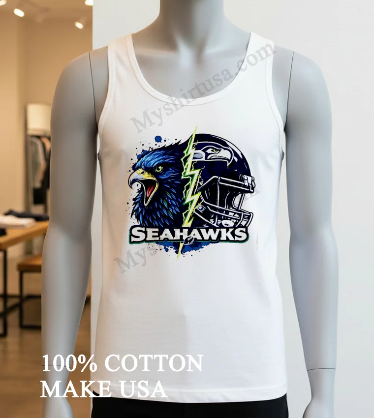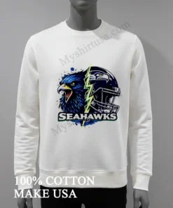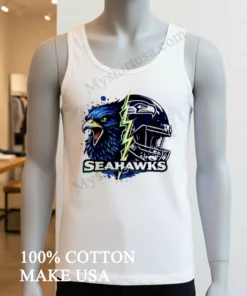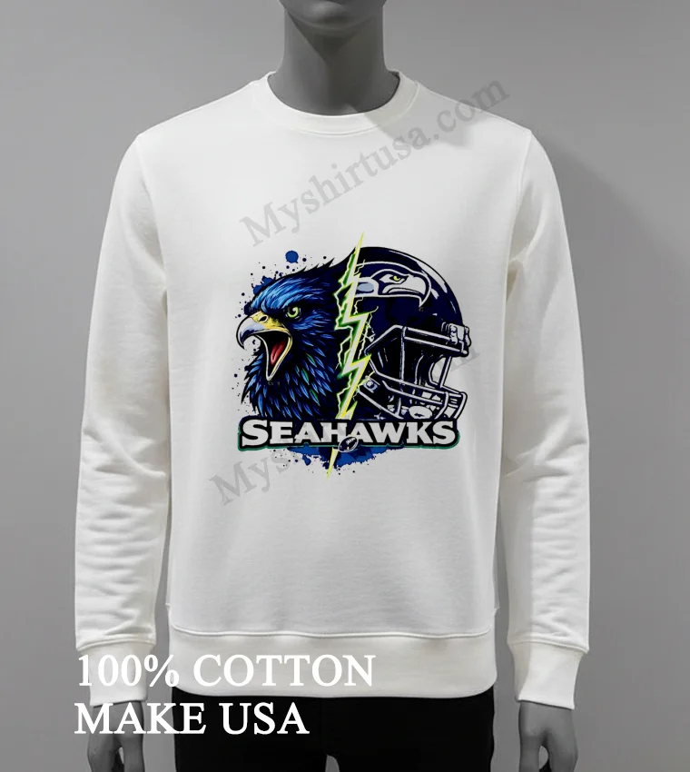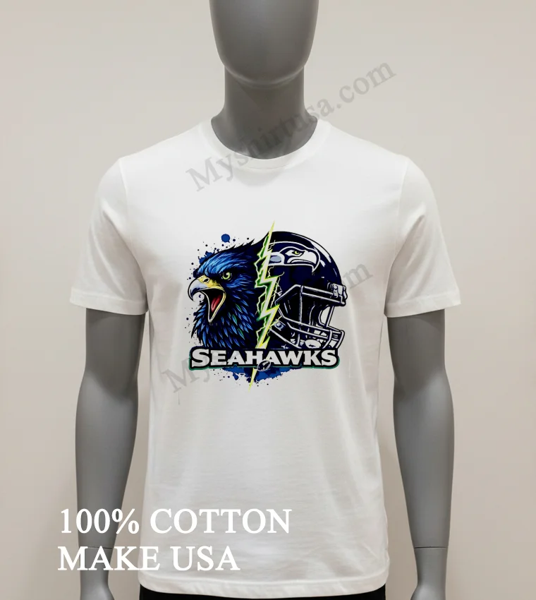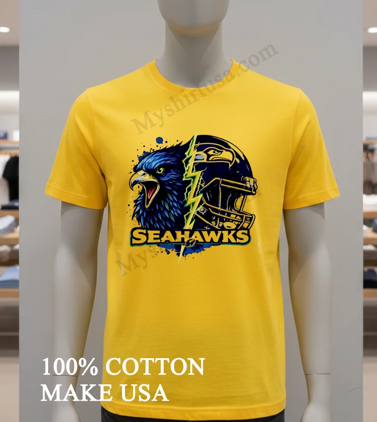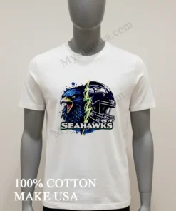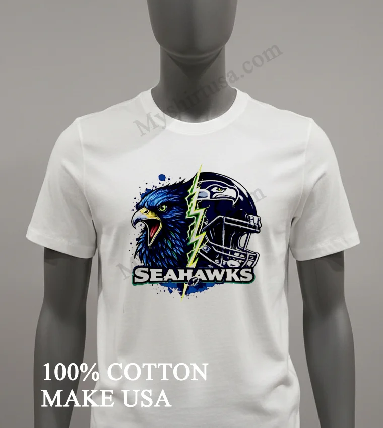 Now, let’s really get into what makes this shirt a cut above the rest. The design itself is a masterpiece of fan artistry. It’s not just a logo slapped on a tee; it’s an intense, split graphic featuring the fierce Seahawks eagle head merging with a dynamic lightning bolt and a helmet, creating an electrifying visual. This isn’t your grandma’s faded team shirt; it’s bold, modern, and instantly recognizable without being over-the-top. While other T-shirts might offer a simple emblem, this design captures the raw power and spirit of the Seahawks, giving you an edge. And the material? We’re talking 100% premium American cotton that feels incredibly soft against your skin, with just enough stretch to move with you, whether you’re jumping up for a touchdown or just chilling on the couch. Style it effortlessly: throw it on with your favorite distressed denim and classic sneakers for that laid-back streetwear vibe, or layer it under an open flannel shirt for a Pacific Northwest cool. To keep this gem looking sharp, wash it inside out in cold water, and tumble dry on low. Treat it right, and this shirt will be a staple in your wardrobe for seasons to come.