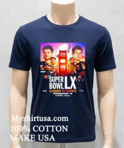 Now, let’s talk about what makes this shirt truly special. You see a lot of generic team gear out there, right? But this isn’t that. This T-shirt stands apart with its bold, high-fidelity graphic, bringing together the iconic colors of the Seahawks (that vibrant blue and green!) and the Patriots (classic red and navy) in a dynamic, almost clash-of-the-titans design. It’s got that official-looking Super Bowl LX logo and the exact date, making it feel less like a “what if” and more like a “when.” This shirt isn’t just a design; it’s a piece of future history for the fan who knows their stuff, the one who lives for the speculation and the thrill of the game. You won’t find this kind of specific, forward-thinking design on most sites, which means you’re wearing something truly unique. And the material? Forget that stiff, scratchy cotton. This shirt is crafted from 100% premium American cotton, ringspun for an incredibly soft, breathable feel that’s like your favorite worn-in tee from day one. It’s got that perfect relaxed fit not too tight, not too baggy embodying that classic “American style” that’s all about comfort without sacrificing cool. Throw it on with your favorite distressed denim, a pair of vintage sneakers, and a baseball cap for an effortless game-day look. Or, layer it under an open flannel or a sleek bomber jacket when the evening chill sets in. For the ladies, tie it up with high-waisted shorts or rock it oversized with biker shorts for that “athleisure chic” vibe that’s everywhere right now. To keep this beauty looking fresh, just machine wash it cold, inside out, with like colors that protects the vibrant print. Tumble dry low, or even better, hang dry to prevent any shrinkage and keep that graphic sharp. No bleach, ever! Treat it right, and it’ll be your lucky Super Bowl shirt for years, regardless of who makes it to the big game.