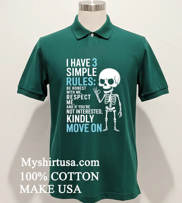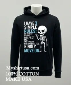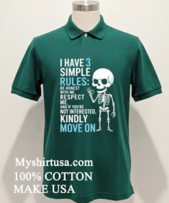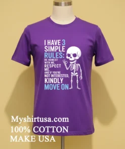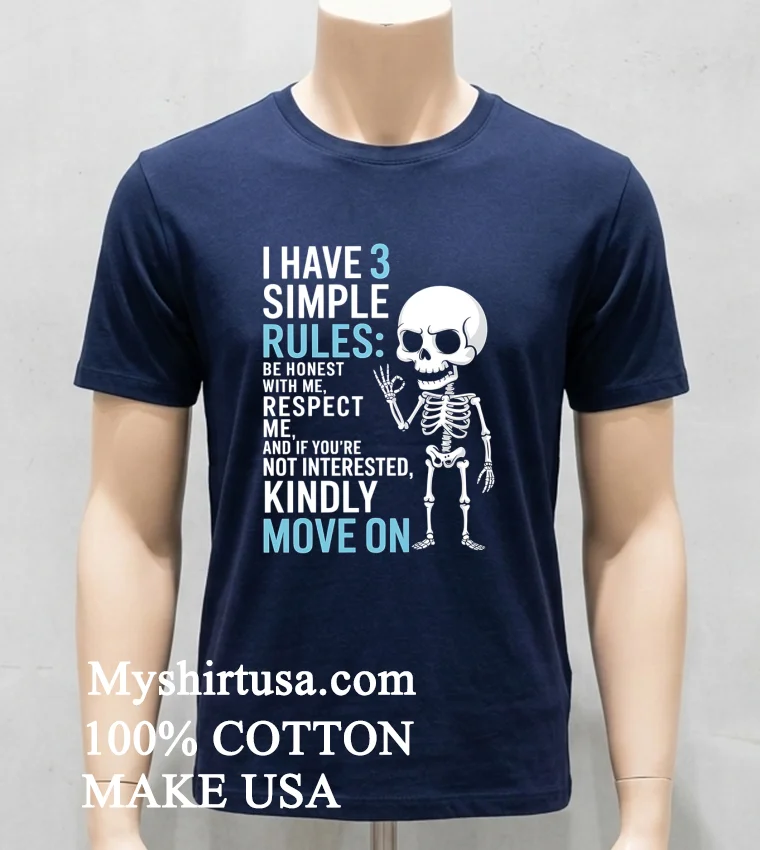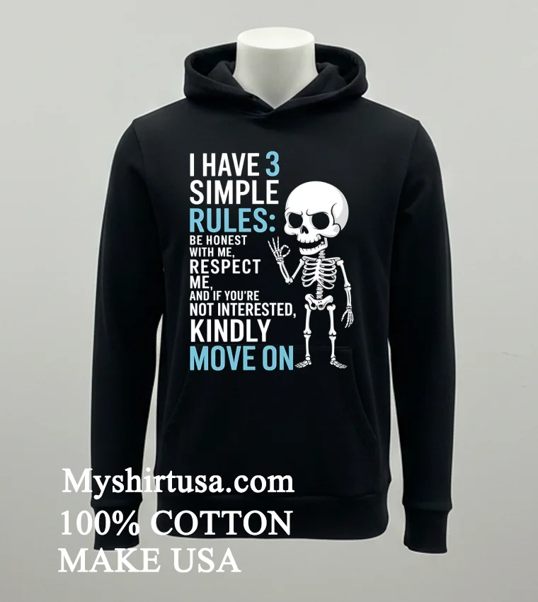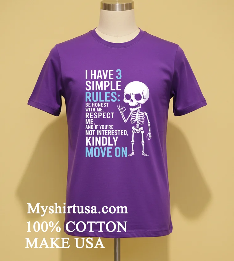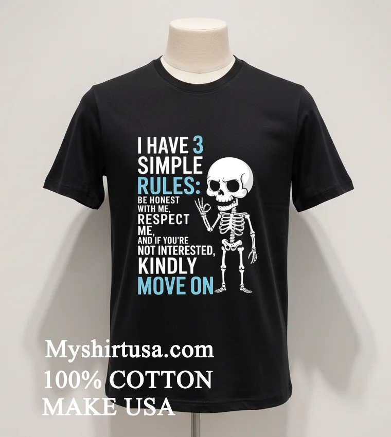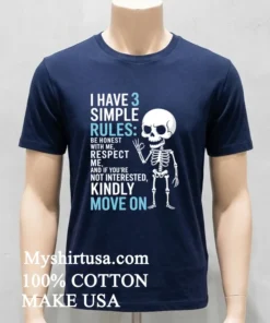 Ready to make your statement? Why settle for anything less than quality, comfort, and a message that resonates? Grab your own Skeleton I Have 3 Simple Rules Be Honest With Me Respect Me And If You Re Not Interested Kindly Move On Shirt today! Crafted from 100% American Cotton soft, stretchy, breathable for just $23. Enjoy fast US delivery in 3-5 days. It’s vintage, streetwear, and authentic American style, all in one.