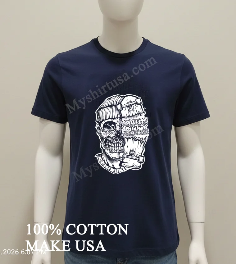 Ready to upgrade your wardrobe with a piece that tells a story? Why settle for less than 100% American Cotton soft, stretchy, breathable, and built to last? For just $23, get this perfect blend of Vintage, Streetwear, American style delivered in 3-5 days. The Slam City Skatepark Skull Wearing Beanie Hat Skateboard Shirt only at Myshirtusa! #vintagetshirt #americanfashion #skatestyle #streetwearusa #graphictee