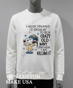 Ready to declare your ‘killing it’ status? Why settle for boring when you can wear a story? Grab your Snoopy Crazy Old Nany Drinking Wine Killing It Shirt today! Crafted from 100% American Cotton, it’s soft, stretchy, breathable perfection for just $23 USD. Experience our commitment to high-quality, beautiful t-shirts delivered quickly 35 days in the US! Embrace Vintage, Streetwear, and true American style.