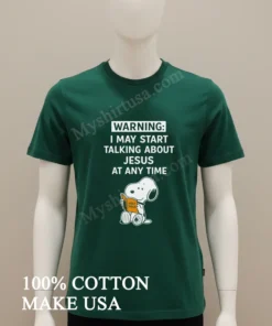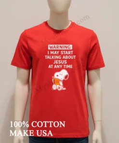 In today’s world, where faith-based conversations and humor merge, this tee is so relevant. Think online trends or family gatherings. It perfectly taps into that, making it a must-have for Christian fellowship or just sharing a smile. Finding your own Snoopy I May Start Talking About Jesus At Any Time Shirt is a breeze, whether you’re searching for ‘Snoopy Jesus shirt,’ ‘Christian humor tee,’ or ‘faith statement apparel.’