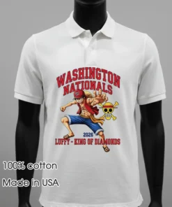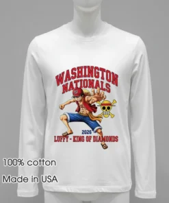 Let’s talk details, because this isn’t your average souvenir tee. Its incredible originality immediately strikes you. It masterfully fuses iconic Washington Nationals branding – think a subtle curly W or team colors – with the dynamic artistry of One Piece. Luffy as the ‘King of Diamonds’? That’s pure genius, offering a fresh twist to both the baseball diamond and pirate lore. This isn’t a slapped-on graphic; it’s a meticulously crafted piece designed to truly stand out. It’s for the fan demanding more than just a logo, a tee that sparks conversation and expresses multi-faceted passions.