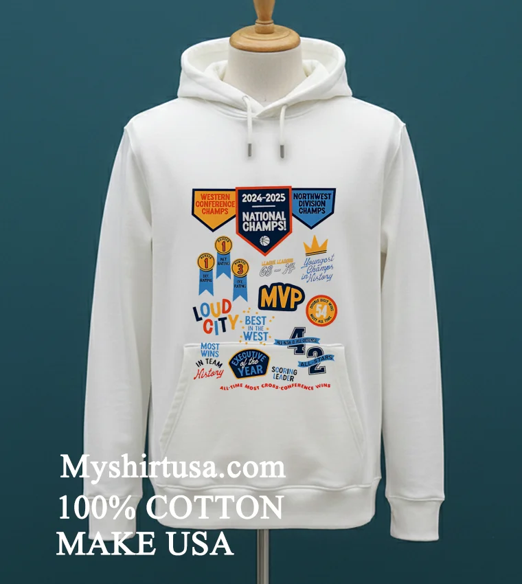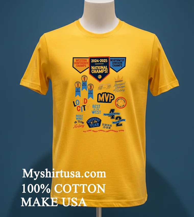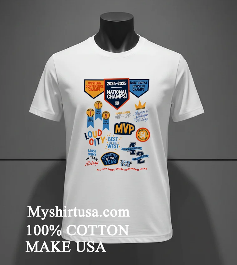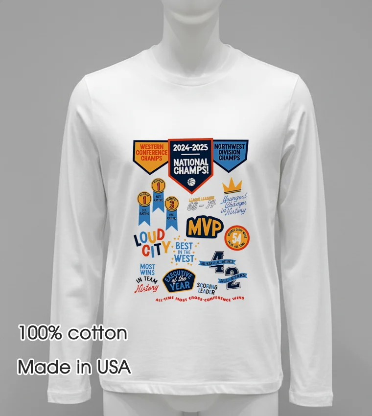 Now, let’s talk about the shirt itself. You’ve seen those flimsy tees that lose their shape after one wash, right? This isn’t one of them. The design on this bad boy isn’t some cheap iron-on that’s going to crack and peel. It’s printed with precision, ensuring the “Western Conference Champs 2024 2025 National Champs Northwest Division Champs” text, bold and proud, stays vibrant season after season. What sets it apart from those generic stadium souvenirs? It’s the quality of the print paired with the premium feel of the fabric. We’re talking 100% American Cotton here, a material renowned for its softness, breathability, and just the right amount of stretch. It’s cut in a style that’s a perfect blend of vintage and modern streetwear not too boxy, not too tight, just that ideal relaxed fit that drapes well. You can throw it on with your favorite distressed jeans for a classic game-day look, layer it under a flannel for a cooler evening, or even pair it with some crisp chinos for a slightly more elevated, yet still casual, vibe. And caring for it? Simple. Machine wash cold with like colors, tumble dry low. Avoid bleach. It’s designed to withstand the passion of a true fan, keeping its good looks through countless celebrations.