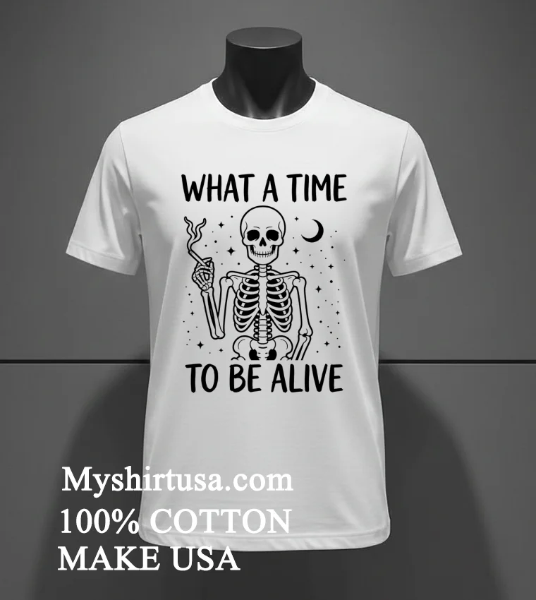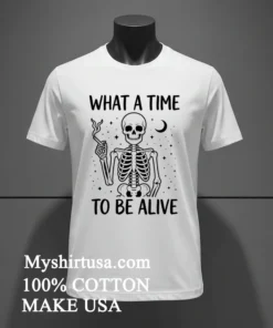 Let’s talk about the shirt itself. Forget those flimsy, boxy tees that feel like they were made for someone else. This isn’t that. The design is simple yet striking: a stylized skeleton, maybe doing a little shrug or a dance, with the bold, cheeky phrase “What A Time To Be Alive” printed right there. It’s got a slight vintage wash feel to the print, not too bright, not too faded, giving it that perfectly lived-in look right out of the package. It stands out without screaming for attention, making it incredibly versatile. Made from 100% premium American cotton, it’s not just soft; it’s seriously soft, with a comfortable stretch that moves with you, whether you’re reaching for coffee or throwing your hands up at a game. The unisex fit means it drapes just right not too tight, not too baggy perfect for tucking into some high-waisted jeans, layering under an open flannel, or pairing with your favorite denim shorts for that classic American, effortlessly cool vibe. To keep this gem looking its best, just turn it inside out, machine wash cold with like colors, and tumble dry low. No bleach, and definitely don’t iron directly on the graphic. Treat it right, and this shirt will be your faithful companion through many more wild times.