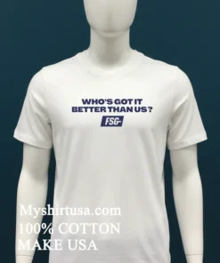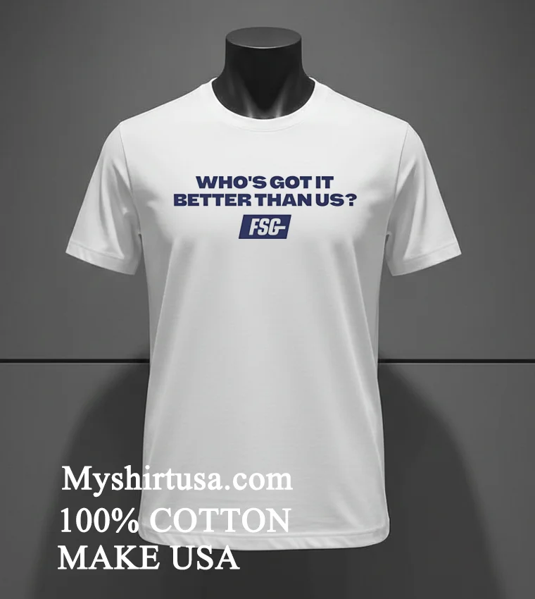 Ready to feel that championship confidence? Why wait to own a piece of that winning spirit? Our Who S Got It Better Than Us Fsg Shirt is crafted from 100% premium American Cotton soft, stretchy, breathable, and priced at just $23 USD. Get yours with fast 3-5 day delivery right here in the US! Embrace that Vintage, Streetwear, American style today.