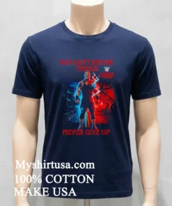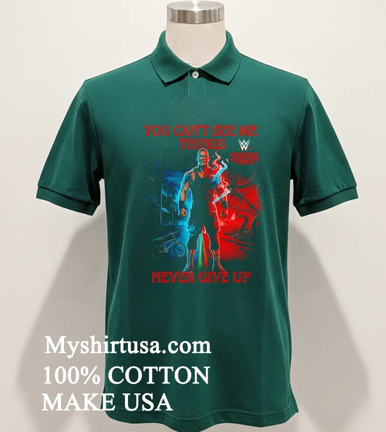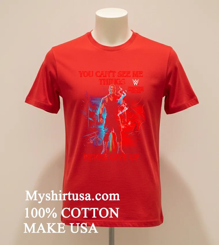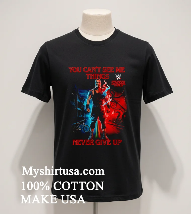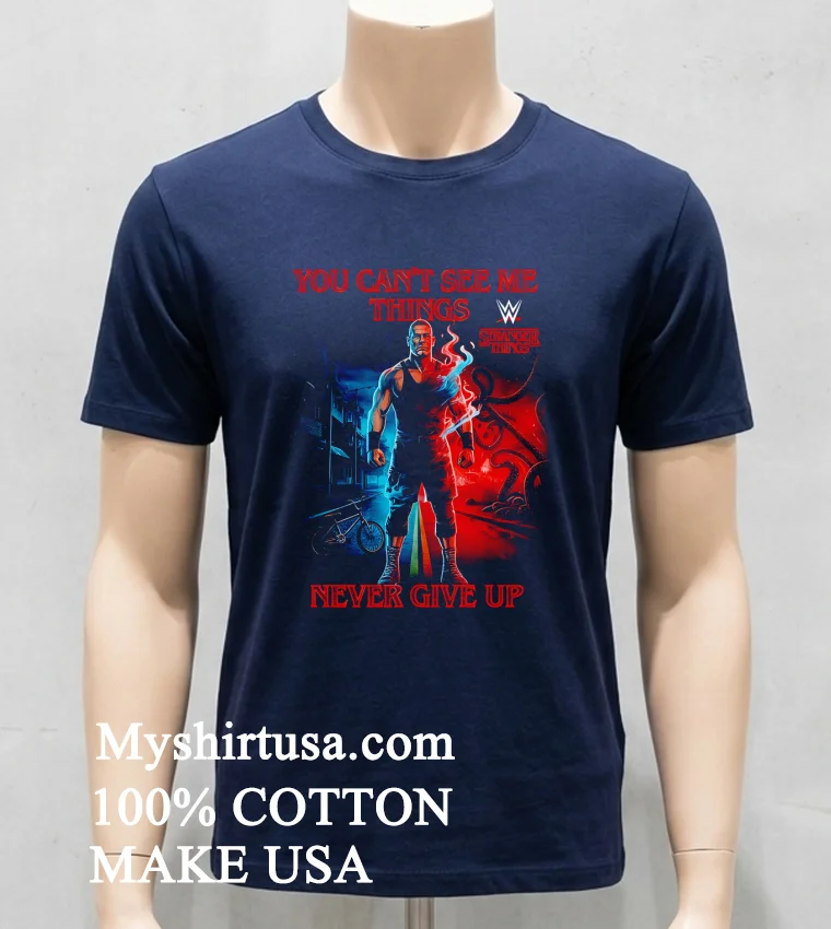 Let’s be real, a T-shirt isn’t just a T-shirt. It’s gotta tell a story and feel good doing it, right? And this one? Oh man, it’s a whole saga wrapped up in clever design. The graphic seamlessly merges John Cena’s iconic “You Can’t See Me” hand gesture with unmistakable elements from the Upside Down maybe a subtle shadow of a Demogorgon lurking, or the distressed, almost eerie aesthetic reminiscent of Hawkins. Then, the “Things Never Give Up” slogan isn’t just a cool phrase; it echoes both Cena’s unyielding spirit and the resilience of the Stranger Things crew, giving it a deeper meaning than your average graphic tee. What really sets it apart from those generic fan shirts? It’s the intelligent, witty fusion. It’s not just slapping two logos together; it’s a creative conversation between two pop culture giants. When it comes to the feel, we’re talking about that sweet spot of comfort. Crafted from 100% premium American Cotton, it’s soft, breathable, and has that perfect lived-in feel from the first wear. The fit is a classic unisex style, making it super versatile. For a casual look, throw it on with your favorite distressed denim shorts and high-top sneakers. For a more edgy street style, layer it under an open flannel shirt with some dark wash jeans and boots. And caring for it is a breeze, because who needs high-maintenance clothes? Just toss it in the wash with cold water, inside out, on a gentle cycle to protect the print. Tumble dry on low or, even better, hang dry to keep that graphic looking sharp for years. Avoid harsh bleaches or ironing directly on the design, and this tee will be your go-to for many adventures to come.